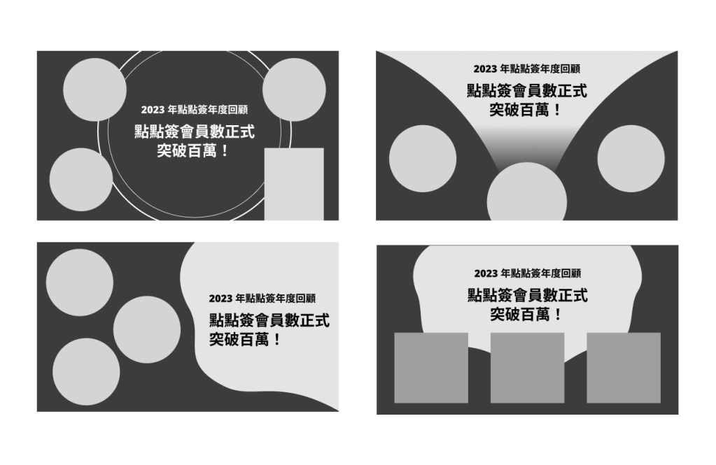 一般在接到設計需求後,我會先整理相關素材,然後嘗試不同的版型設計。像這次的案例,由於公司形象較少使用不規則圓形風格,因此我傾向於採用上方版本相似的設計排版風格。