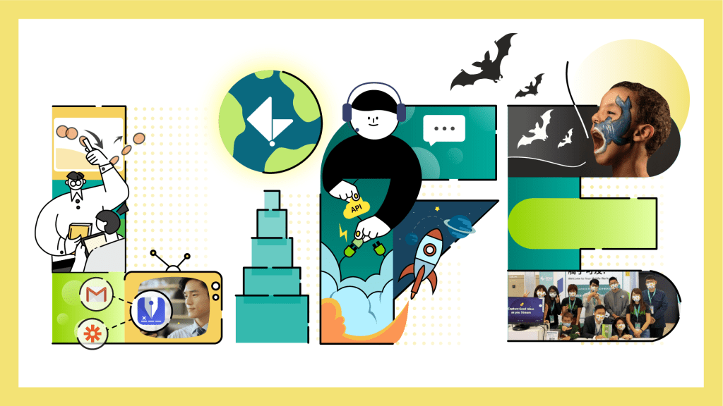 我們以以下三大主題為設計中心,帶出 Tech as Life Force 科技始終來自人性。自疫情爆發後許多新的生活模式、服務、商業模式紛紛出現,而公司以軟體服務人群,結合七巧板拼貼出 「LIFE」。