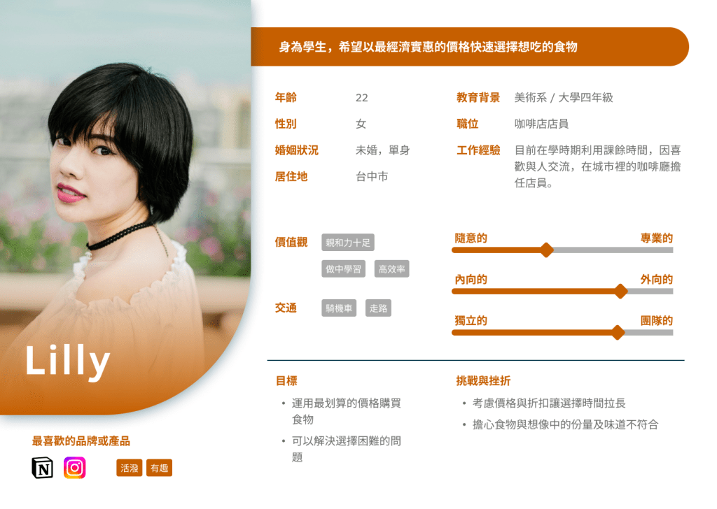 在收集資料後進行了問卷調查,共收集到 107 份問卷,其中 2 份為無效問卷(無使用外送平台經驗)。基於這些有效資料,從使用者的背景與使用習慣,我創建了兩種 人物誌(Persona)並製作 親和圖(Affinity Diagram)更加了解問卷回饋。